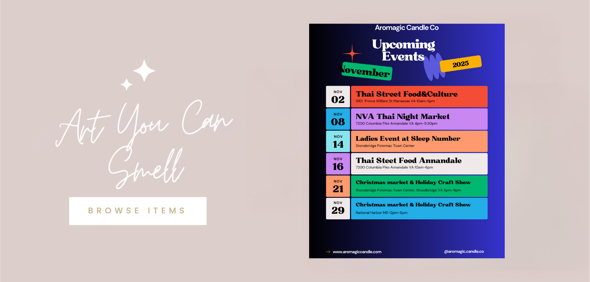 Stay tuned for our upcoming pop-up store at a local market—an opportunity to experience our handcrafted scents in person and connect with our community.